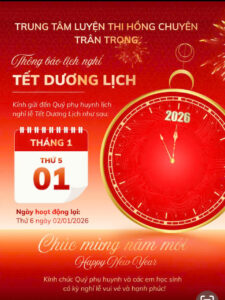 ☘️Trung tâm Hồng Chuyên trân trọng thông báo: – Nghỉ tết Dương lịch 1 ngày (Thứ Năm ngày 1/1/2026). – Thứ sáu ngày 2/1/2026, các em học sinh đi học lại bình thường. 🌈Hồng Chuyên kính chúc quý phụ huynh, các em học sinh cùng với các thầy cô giáo, các em nhân viên có một ngày lễ vui vẻ, ý nghĩa bên gia đình và bạn bè!